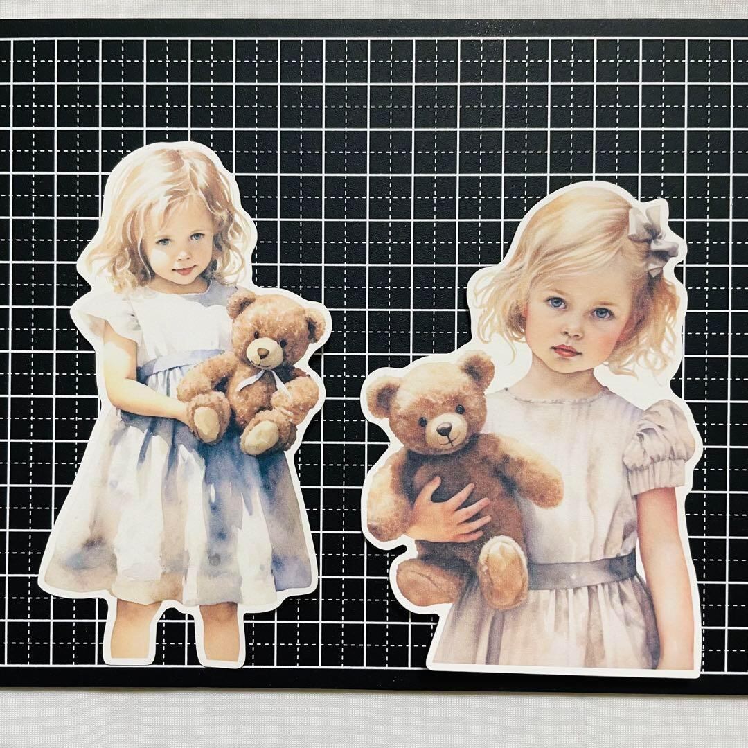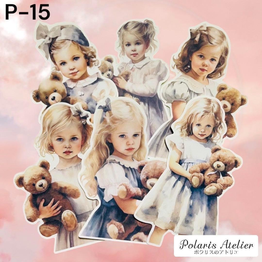 【P-15】コラージュ素材人物ステッカー クマのぬいぐるみを持った女の子